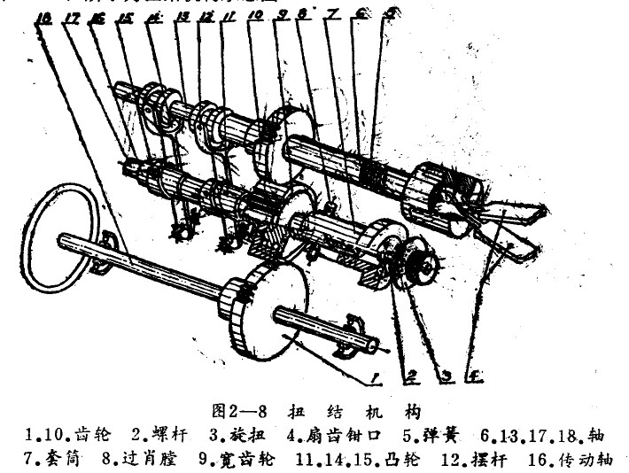 由于紙被扭結(jié)時(shí)長度要縮短,所以園柱凸輪11通過擺桿12,使軸6右移以補(bǔ)償紙的紛短.
